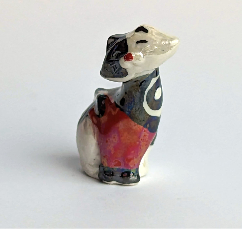 Diese handbemalte Keramikfigur Katze ist eine perfekte Wahl für Katzenliebhaber und Sammler von handbemalten Keramikfiguren. Durch die Kombination aus Weiß, Schwarz und Rot ist sie ein besonderes Highlight in jeder Sammlung und ein echter Hingucker in jedem Zuhause. Kaufen Sie jetzt Ihre handbemalte Keramikfigur Katze und bereichern Sie Ihre Sammlung mit einem einzigartigen Kunstwerk.