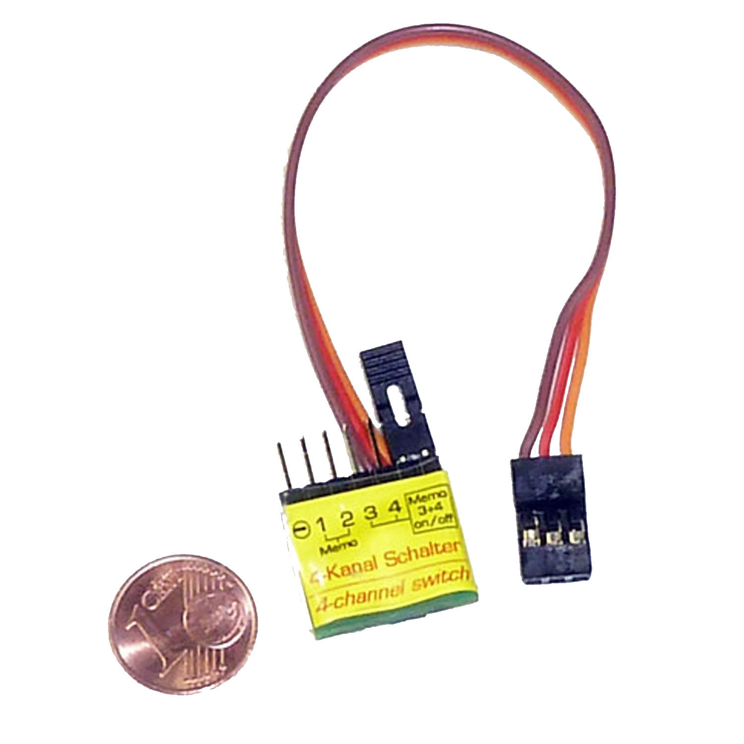 Der Baustein muss nur in den Empfänger eingesteckt werden. Die einzelnen Funktionen werden durch den Steuerknüppel oder einen Schalter am Sender geschaltet. Die ersten beiden Ausgänge sind mit einer Memory-Funktion ausgestattet. Dabei bleibt die Funktion bis zum erneuten Betätigen des Knüppels bzw. Schalters eingeschaltet. Bei Ausgängen 3 und 4 kann die Memory-Funktion über einen Jumper aktiviert bzw. deaktiviert werden.