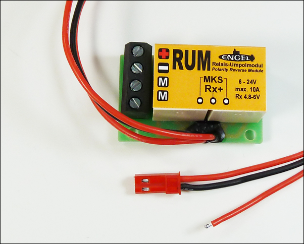 Doppel-Schaltrelais mit Anschlußkabel für 4-Kanal-Schaltbaustein MINI (Nr. 8431) zur Erhöhung der Schaltleistung auf 10 A. Die Relais sind bereits so verschaltet, daß sich nach Anschluß von 4-Kanal-Schaltbaustein MINI, Motor und Akku (Hauptakku+/-, Empfängerakku+) die Funktionen vorwärts-stop-rückwärts ergeben. Geeignet zum Schalten von Sonderfunktionen mit hohem Stromverbrauch, wie Pumpen, Elektromotoren etc.