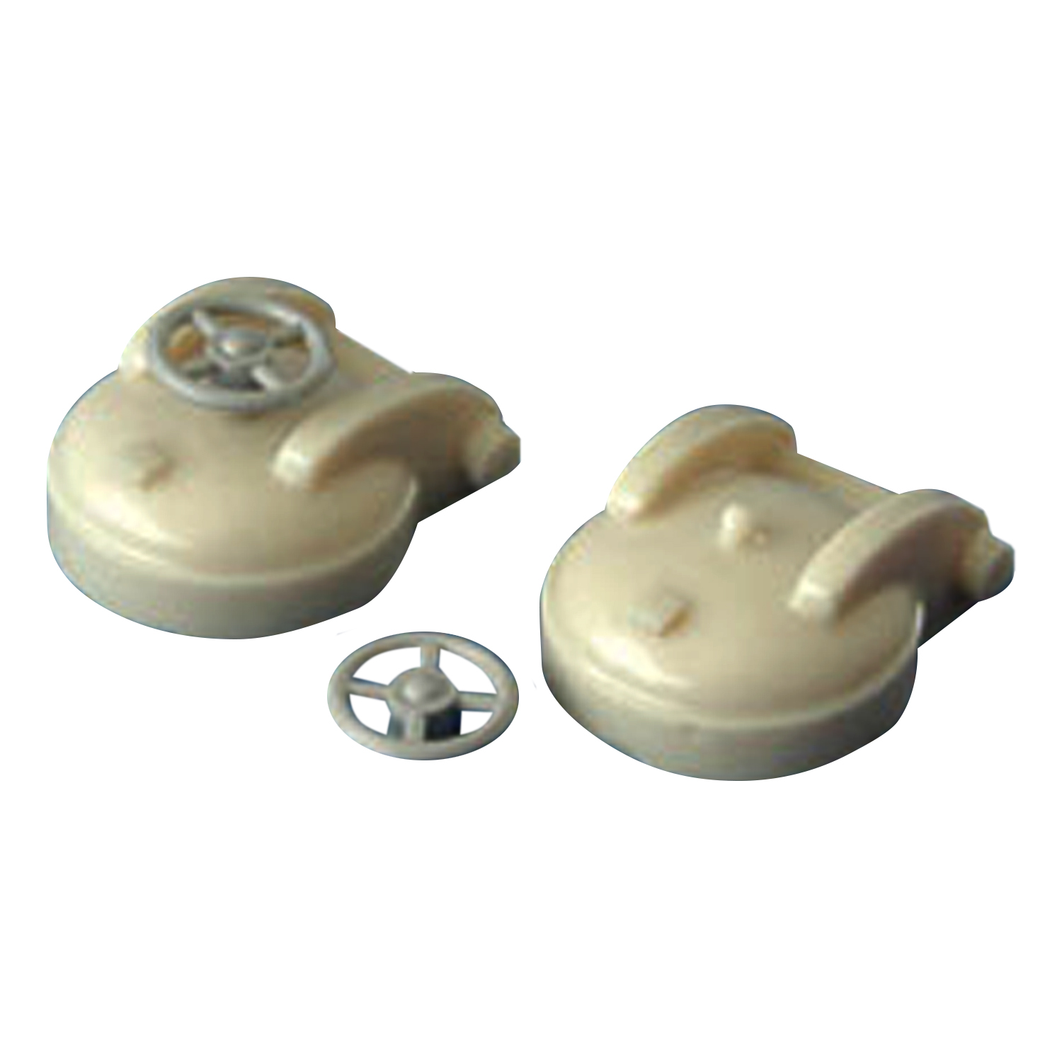 2 Lukendeckel (aus Resin gegossen), komplett mit Handrädern. Durchmesser: 17 mm Höhe: 11 mm passend für Maßstab 1:40 - 1:45 VE 2 Stück