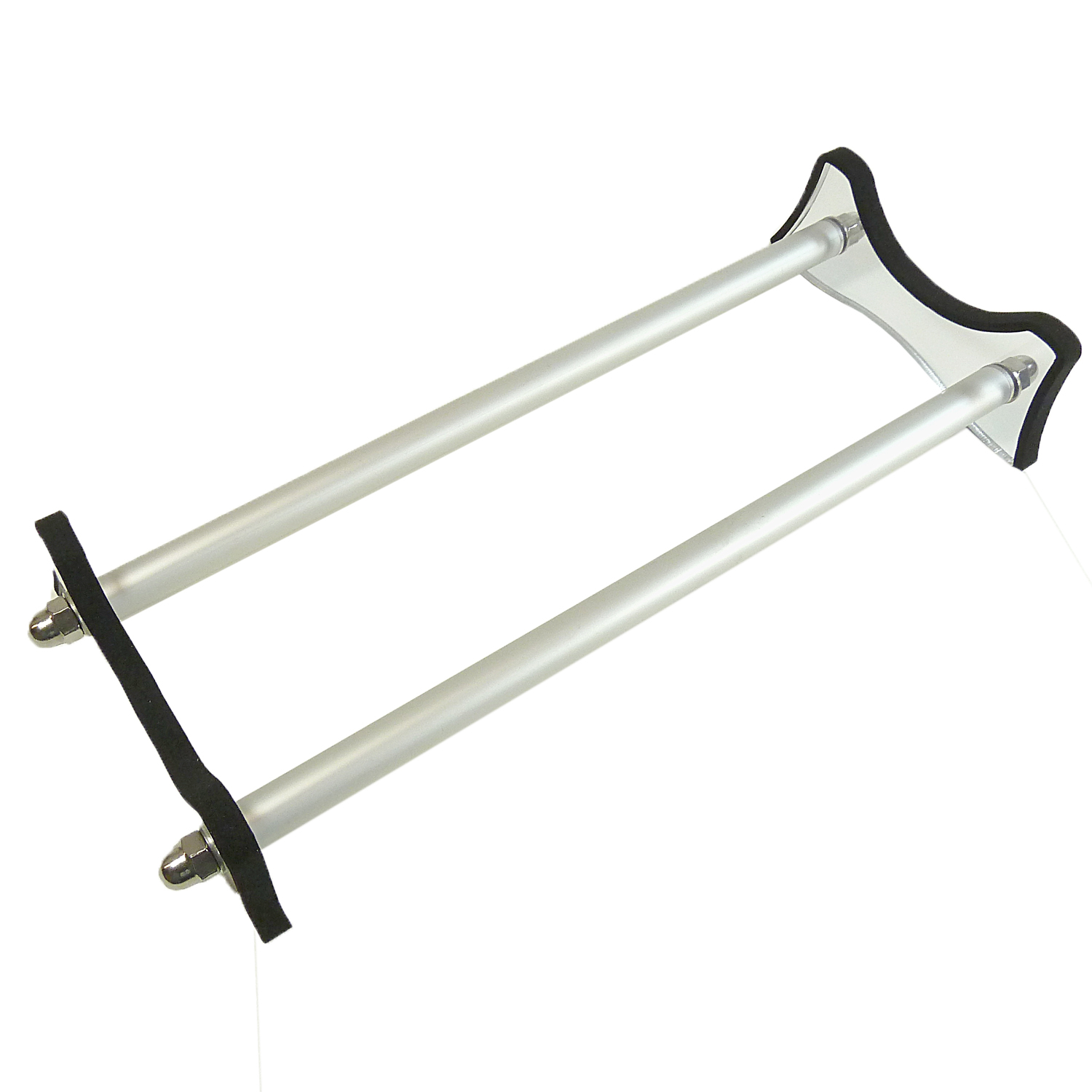 Die Ständerplatten sind aus CNC-gefrästem, 8 mm starkem Acrylglas. Die Zwischenstücke bestehen aus zwei satinierten Aluminium-Rohren, die mit beiliegenden Gewindestangen, Hutmuttern und Scheiben aus Edelstahl verspannt werden. Selbstklebendes Auflageband ist ebenfalls enthalten.