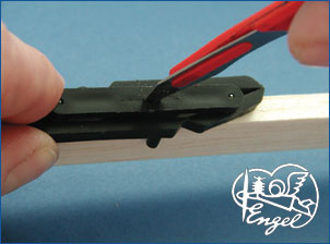 Einfach Scharnierschlitzer auf das Ruder bzw. die Endleiste setzen, Vorrichtung bis auf die Ruder- bzw. Leistenstärke zusammendrücken und mit dem Messer den Scharnierschlitz einschneiden.