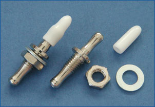 Vernickelter Messing-Nippel für Schläuche mit Innen-ø 2-3 mm. Komplett mit Verschlusskappe, Mutter M5 und U-Scheibe. VE 1 Stück